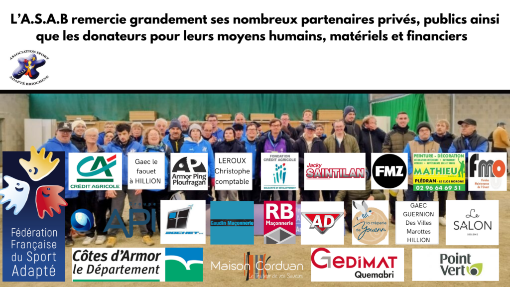 Merci à eux pour leur soutien et leur confiance. Nous remercions également les donateurs privés. L’ASAB remercie tous ses partenaires et les donateurs particuliers pour leur soutien humain, financier et matériel DISTRIVERT – ACVEILLON INVEST – ARMOR PROCESS INDUSTRIE – BOSCHER – AUDIT GESTION – QUEMABRI – TAXI DUSCHESNE – GAEC DE FAOUET
